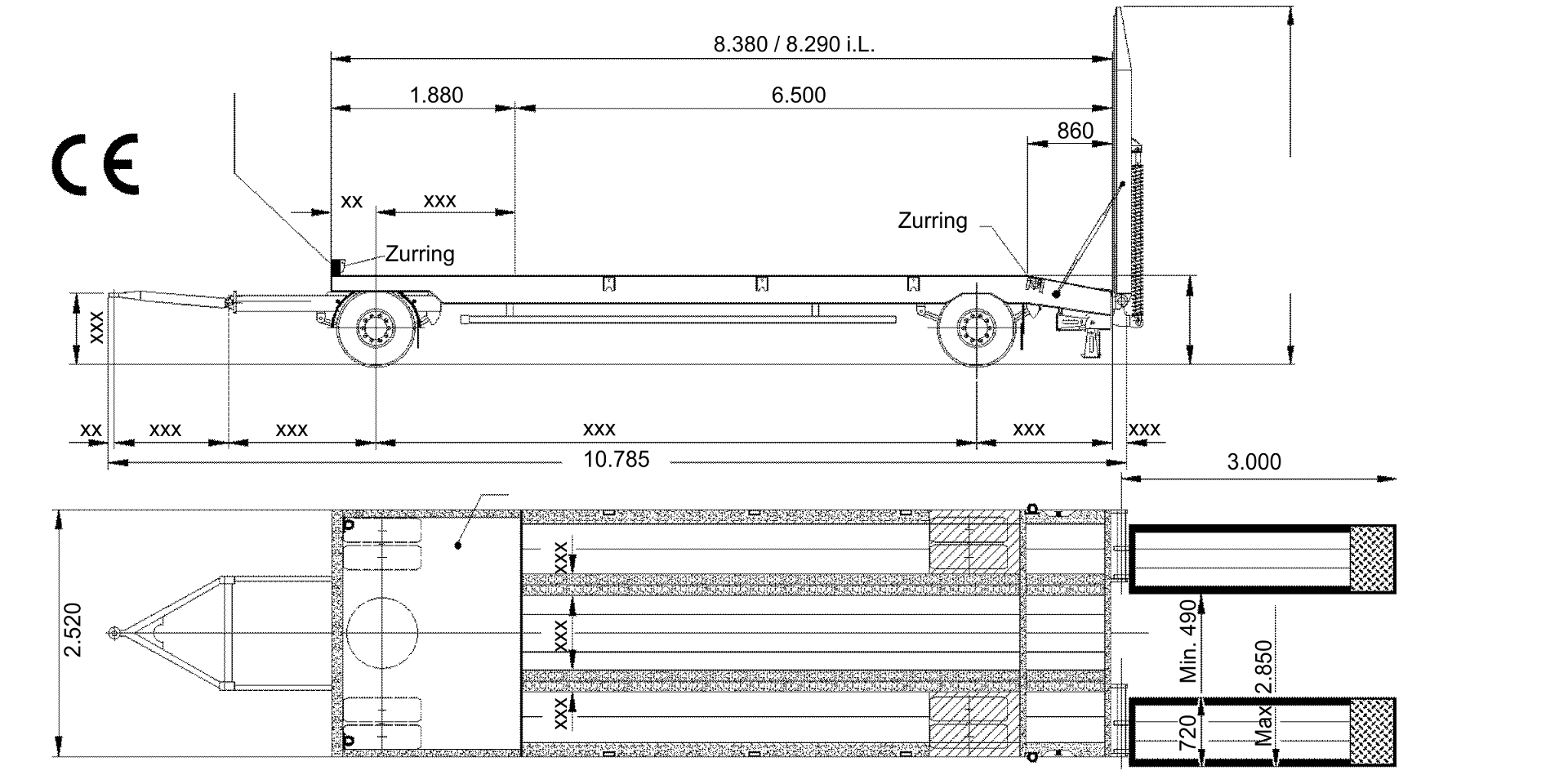 Rampen Einteilige Rampen feuerverzinkt (offene Bauweise) mit eingelegtem, längsverlaufendem Nadelholzbelag, 50 mm stark. Rampenverschub von 2.850 außen auf 490 mm innen. Rampenhaltegestänge mit Einhängemöglichkeit an der Rampe.