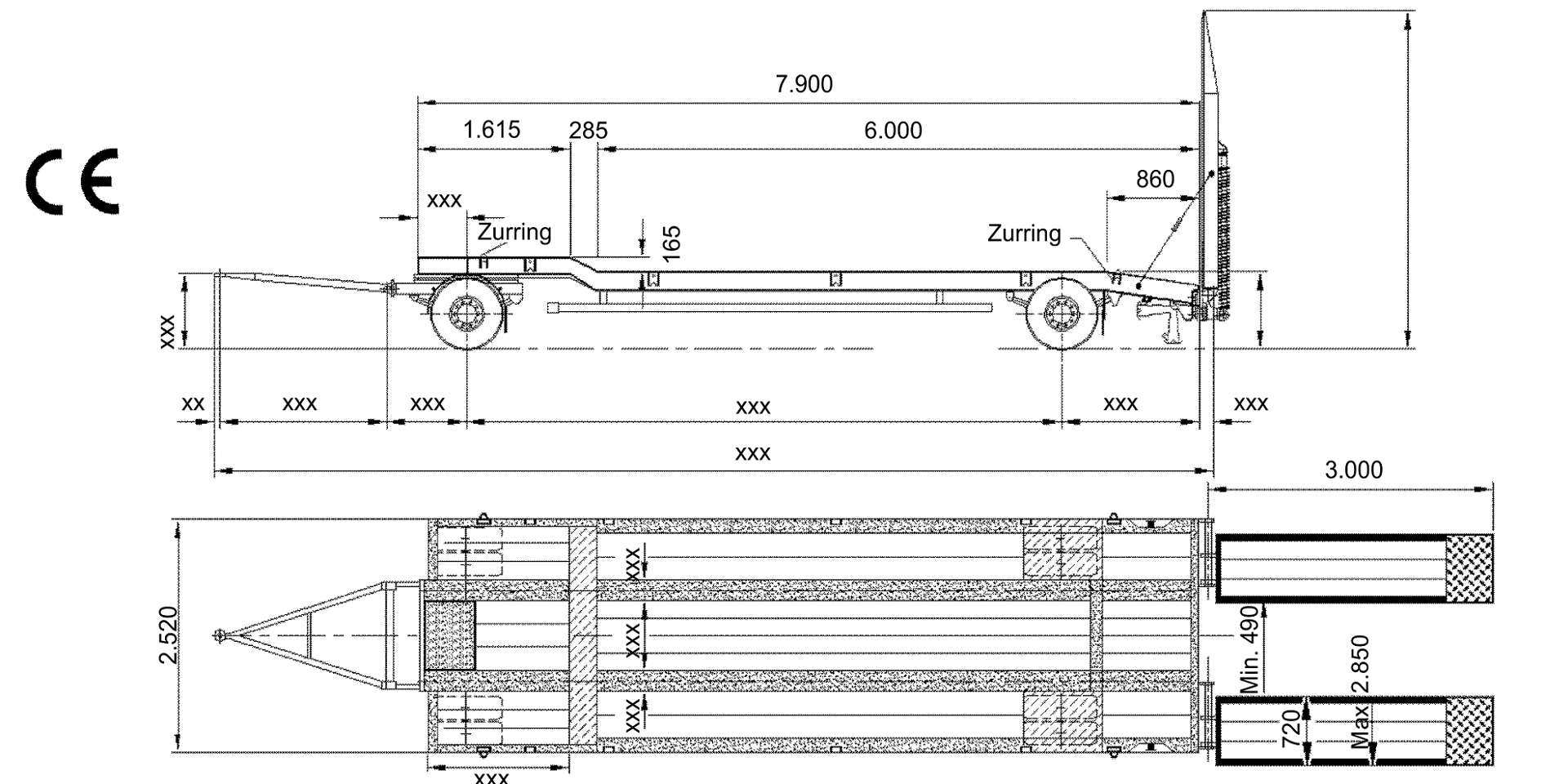 Zweiachs-Überfahr-Tieflade-Anhänger.