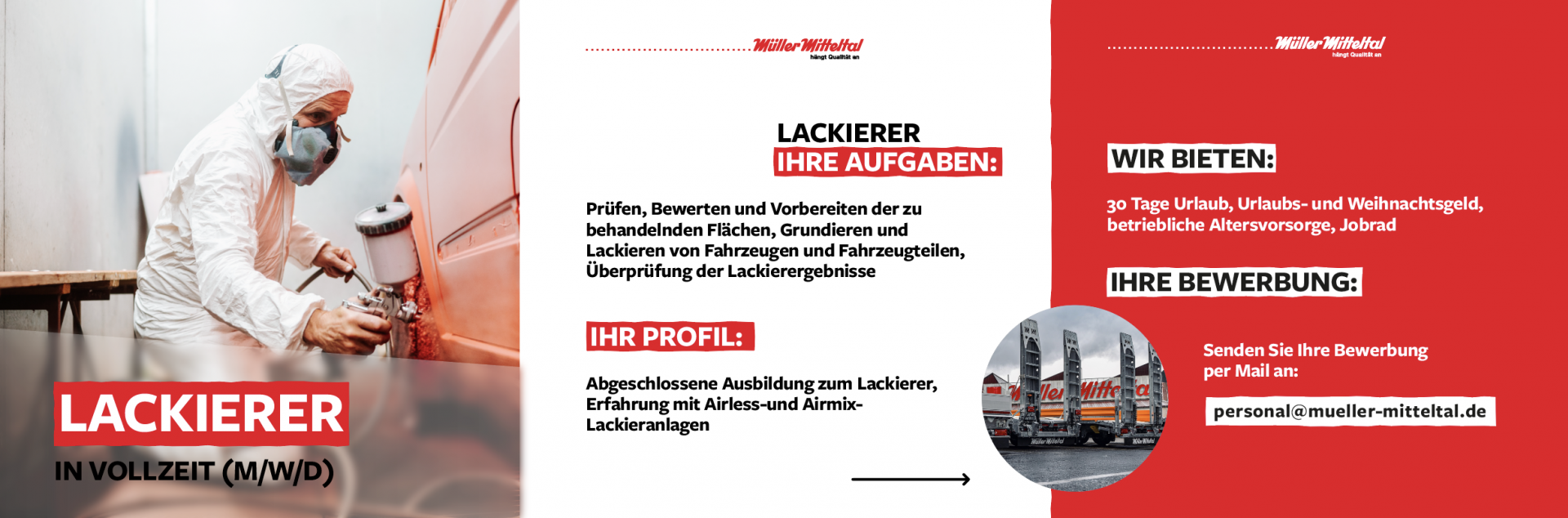 Sie haben eine abgeschlossene Ausbildung als Lackierer und verfügen bereits über fundierte Erfahrung im Umgang mit Airless- und Airmix-Lackieranlagen.