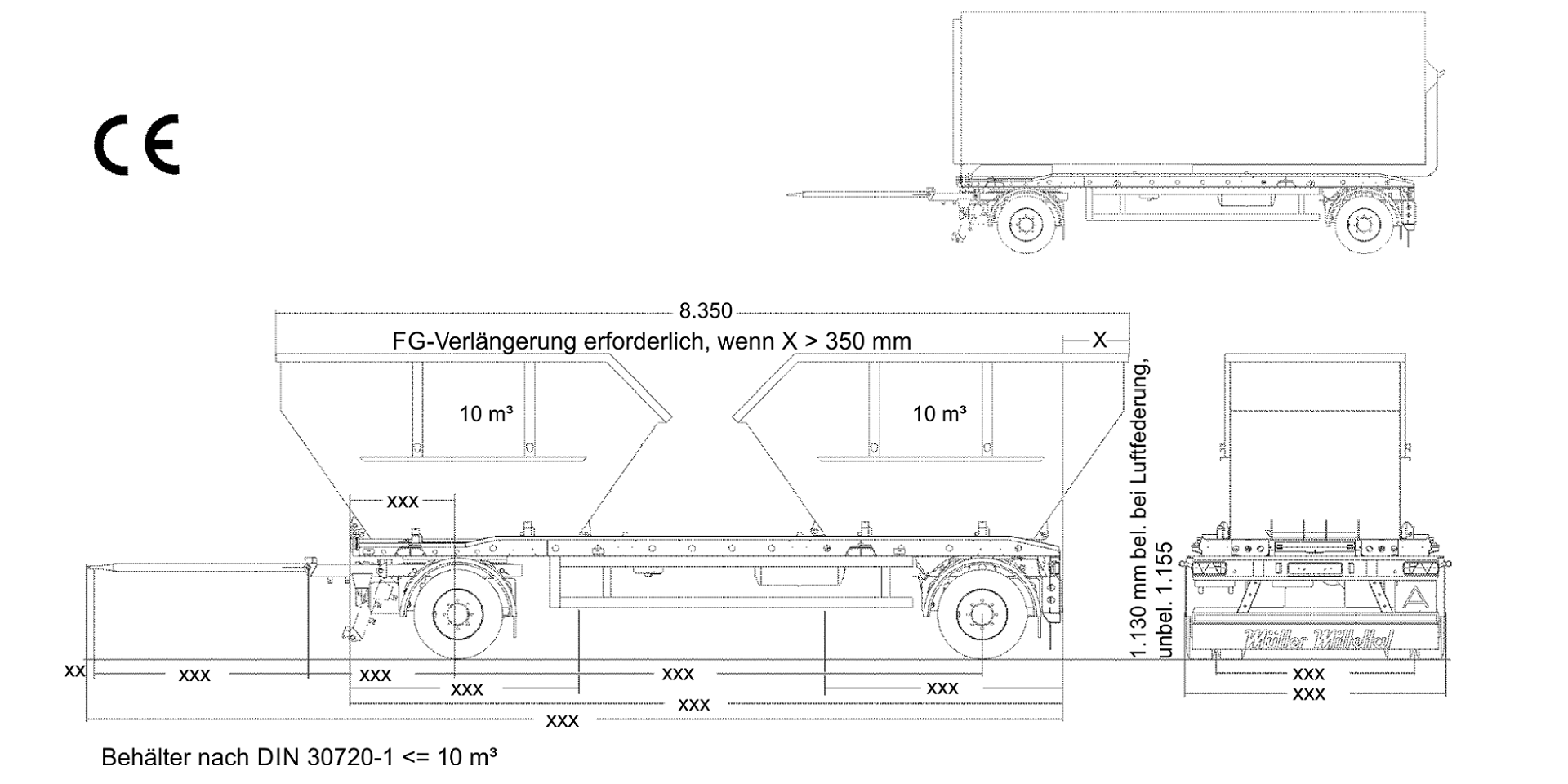 Passend für Rollbehälter mit Außenrollen in den Längen 5.500-7.000 mm i.L. zum Aufschieben von hinten oder 2 Absetzbehälter bis 10 m³ Inhalt.