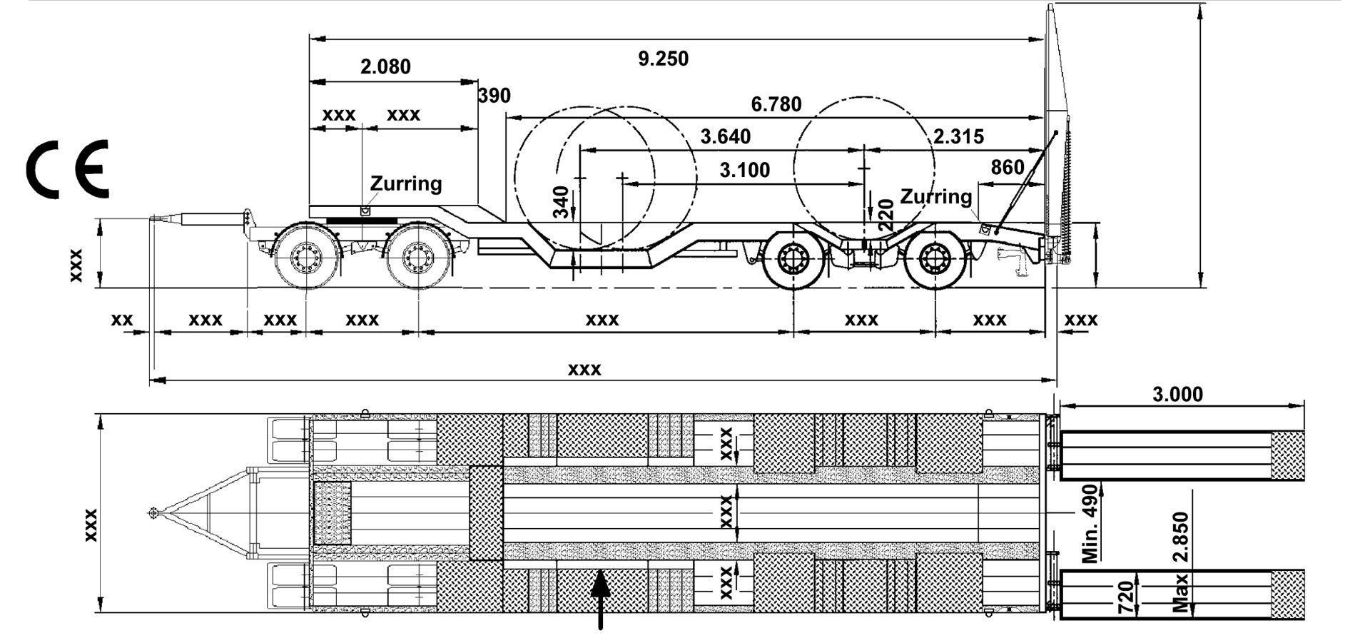Rampen Einteilige Rampen feuerverzinkt (offene Bauweise) mit eingelegtem, längsverlaufendem Nadelholzbelag, 50 mm stark. Rampenverschub von 2.850 außen auf 490 mm innen. Rampenhaltegestänge mit Einhängemöglichkeit an der Rampe.