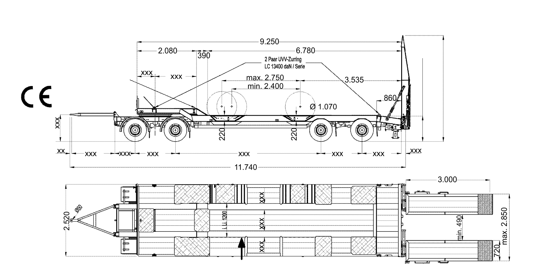 Vierachs-Überfahr-Tieflade-Anhänger mit Radmulden.